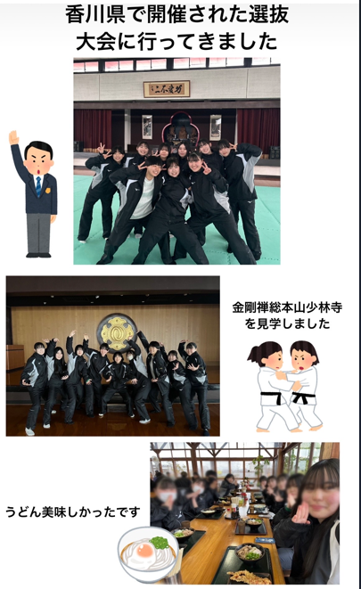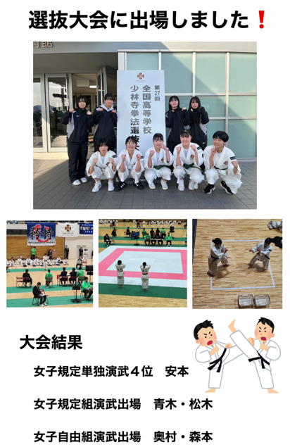 選抜大会では初の快挙!1年生の安本さんが規定単独演武で4位入賞しました。その他、組演武に出場した4人もベストを尽くしてくれました。次の大会が楽しみです。皆様、応援ありがとうございました。