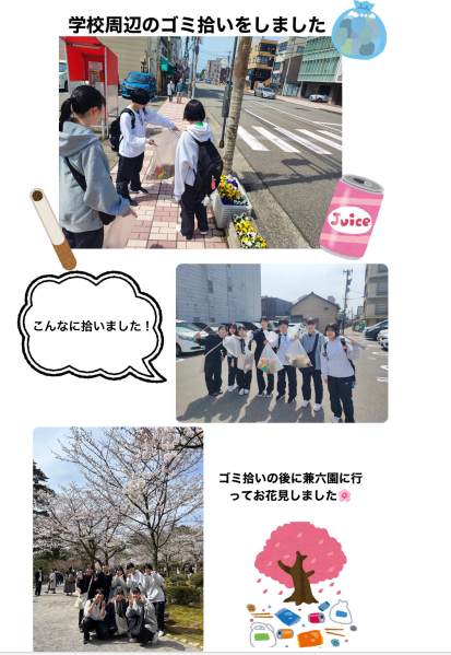 4/6(土)は天気も良かったので、少林寺拳法部員全員で学校周辺の清掃活動を行いました。その後、兼六園に行きました。桜がとてもきれいでした。