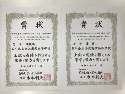 4月23日(土)から5月1日(日)にかけて行われた「石川県バレーボール祭(高校の部)」において、本校女子バレーボール部が優勝、男子バレーボール部が準優勝を果たし、また、優勝した女子は、7月16日(土)から岐阜県で行われる「中部日本総合6人制バレーボール大会」への出場が決まりました。