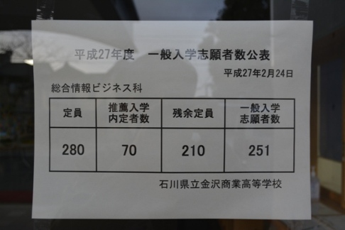 平成27年2月24日(火)、平成27年度一般入学志願者数を正面玄関に張り出しました。