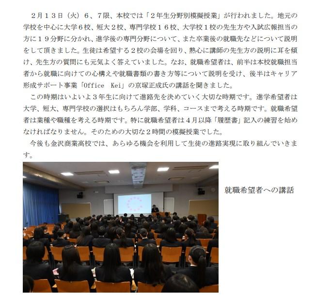 社会で働くようになって感じていることは、金沢商業で勉強した商業の専門科目は今とても役に立っているということです。ExcelやWordなどのソフトウェアを使いこなすことはもちろんですが、授業で見聞きしたビジネス用語やビジネスマナーは、すぐに役立つスキルだといま実感している。簿記の基礎も当時は難しいと感じていたが、その勉強があったから、高度な学習にも挑戦することができたと思っている。本当に金沢商業を卒業してよかった、と何度も話していました。後輩のみなさんも、ぜひ自分の夢に向かって勉強をがんばってほしいとエールを送っていました。
