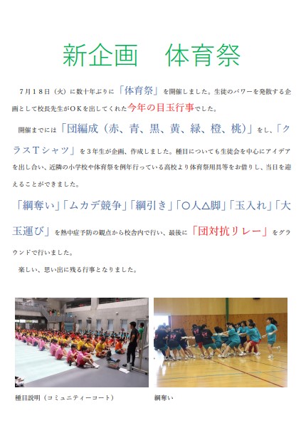 バス待ちをしていた本校1年生女子生徒が、駐車場付近で倒れた年配女性に気づき、声掛けをした。声掛けをしてくれたおかげで熱中症を回避でき、命に別状無くすんだ。猛暑の中、そのまま倒れていたら、命に関わる事故となっていたかもしれない。女子生徒の勇気ある行動に大変感謝している、とのことでした。
