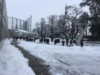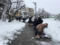 2023年1月27日 09時14分きょうの除雪当番にあたっていた16Hの皆さんが、担任の長山先生と一緒に、正門付近の除雪作業をしました。