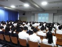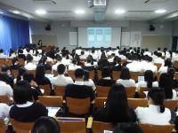 8月17日(水)3年生進学希望者約150名を対象に金沢星稜大学女子短期大学部准教授山田範子先生をお招きし、「志望理由書の書き方と面接の極意」というテーマで約一時間お話をしていただきました。大学入試における志望理由書について「論理的に書くこと」「飾らずに自分の言葉で書くこと」など具体例を交えながら丁寧な説明を受けました。また、面接については「入試での面接は対話のつもりで」「スピーチするスキルも大切だが、聞く能力も大切だ」「自分の頭で考えた言葉で話すように」など大変貴重なお話を聞くことができました。