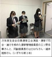 リモートで行われた立会演説では、「会長」・「副会長」に立候補した4名の生徒(いずれも新3年生)が、金沢商業高校の中心として、学校全体を盛り上げたいという熱い思いを語りました。