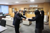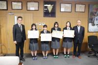 今年は応募作品の中から、山田万由子(まゆこ)さん(3年)と田口悠花(はるか)さん(3年)の2名が「会長賞」。土屋綺羅(きらり)さん(2年)と中田美咲(みさき)さん(2年)の2名が「佳作」。計4名の生徒が受賞し、本日、金沢間税会より「表彰伝達」が行われました。