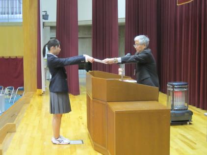 同窓会奨学奨励賞授与式では、同窓会役員の方9名にご来校いただき学習活動や部活動の優秀者を表彰指定いただきました。