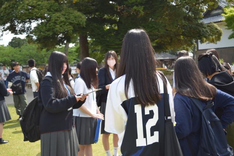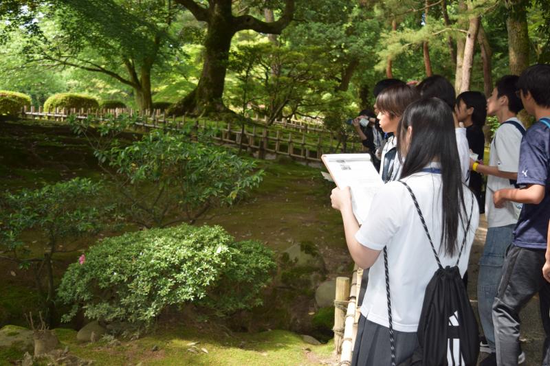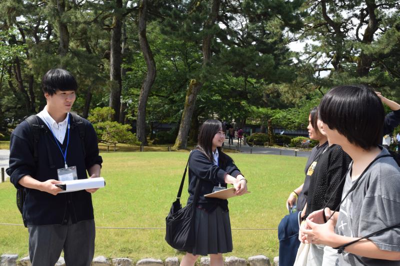 2年生は初めてのガイドでした。事前に金沢市のボランティアガイドのまいどさんからレクチャーを受け、原稿を作成し緊張しながらガイドをしていました。修学旅行生にも好評で、少し自信がつきました。