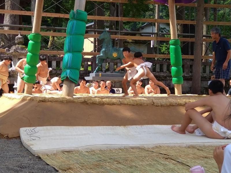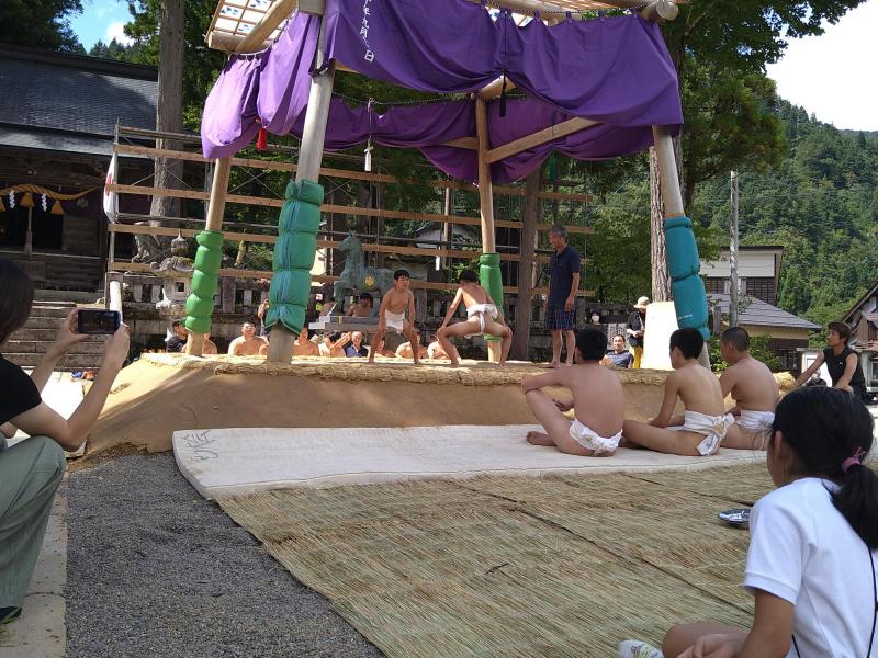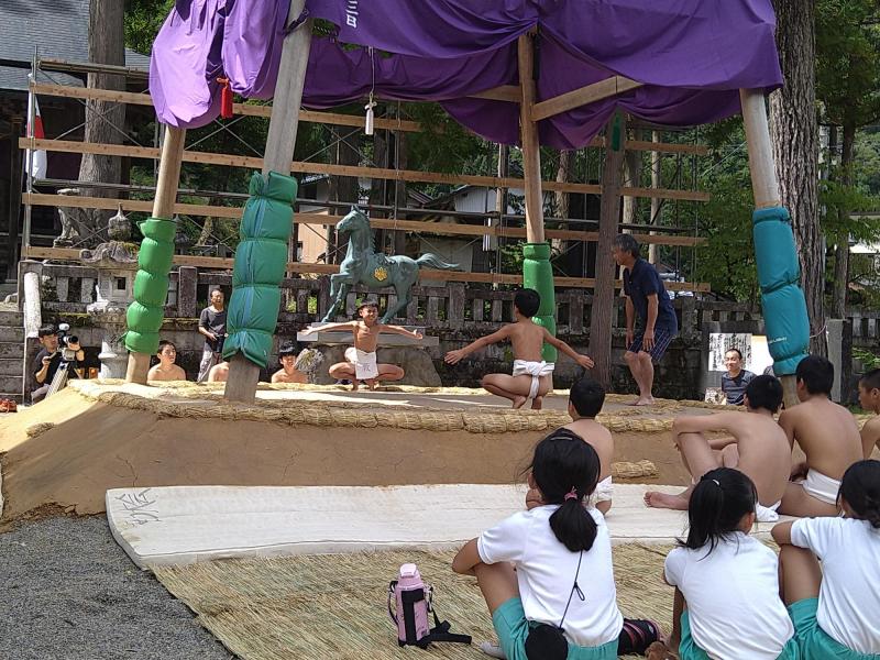 今年は、4年ぶりに奉納相撲に子どもたちも参加することができました。 白峰地区の奉納相撲は、放楽相撲(天領相撲)として、白峰・八坂神社の秋祭りに伴い、毎年9月第2土曜日に境内において行われています。平成27年に白山市指定無形民俗文化財に指定された放楽相撲は、110年以上の歴史をもち、民俗学的にも大変貴重なものだそうです。「白峰相撲協会」と「白峰青年団」が連携しながら運営や存続に努め、今もなお継承実施されている大変珍しい文化財といわれています。 以前は、学校行事として相撲大会を実施していましたが、児童数の大幅な減少に伴い、地域の相撲大会に参加するという方法に変更されました。このような状況にあっても、長い歴史に育まれた貴重な相撲大会に地元の子どもたちが参加できるということは本当に意味深いものであり、伝統や文化の継承に大きな役割を果たしているように思います。 4年ぶりの開催なので、参加した2年生の子どもたちにとって初めての体験であり、本番までに育友会や相撲協会の方に取組の他、四股や蹲踞(そんきょ)の仕方など丁寧に教えていただきました。そして、当日は青年団の皆さんが長い時間をかけて造り上げた立派な土俵で、真剣な眼差しで力いっぱいの取組を披露していました。力のこもった取組に応援しているこちらまで、熱くなったほどです。 また、5・6年は放送のお手伝いをし、1~3年生は温かな声援をおくっていました。白峰小学校みんなで相撲大会を盛り上げていました。 相撲協会の皆様、青年団の皆様、そして、保護者や地域の皆様、子どもたちのために本当にありがとうございました。今後ともよろしくお願いいたします。