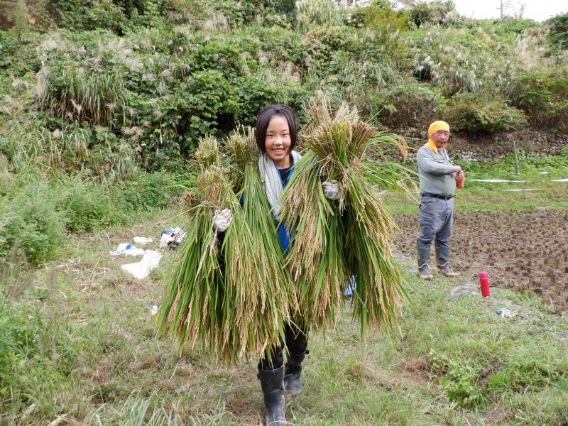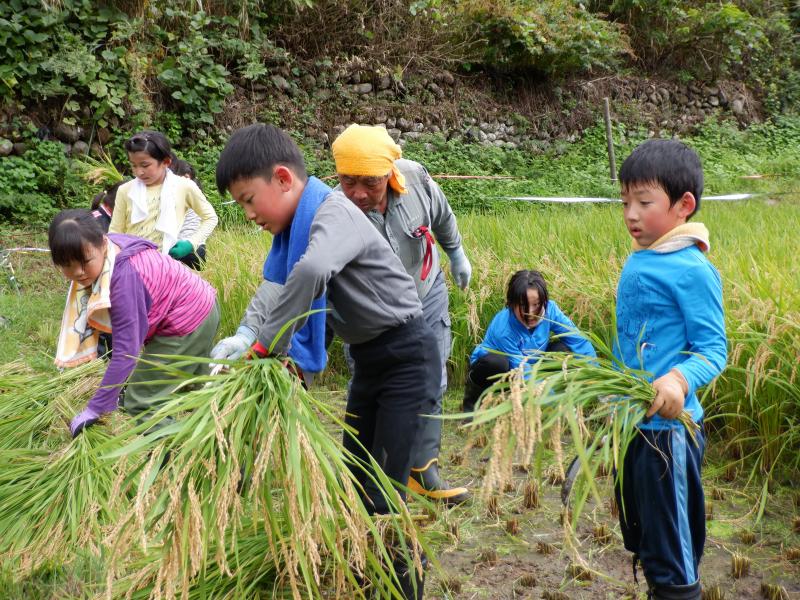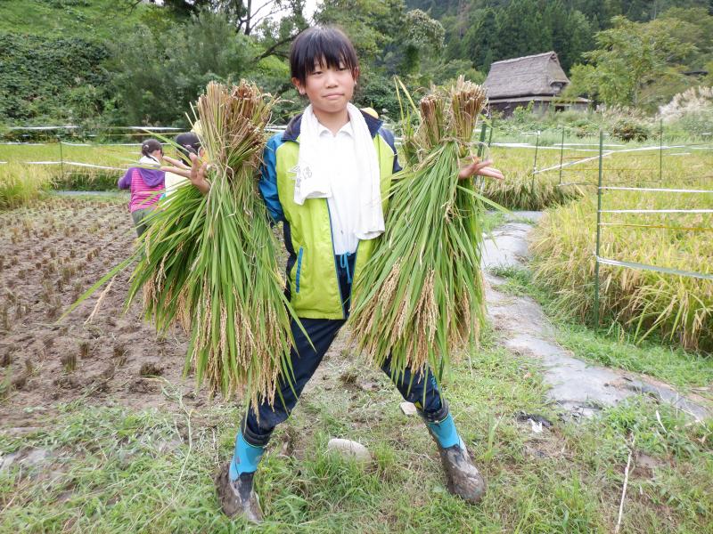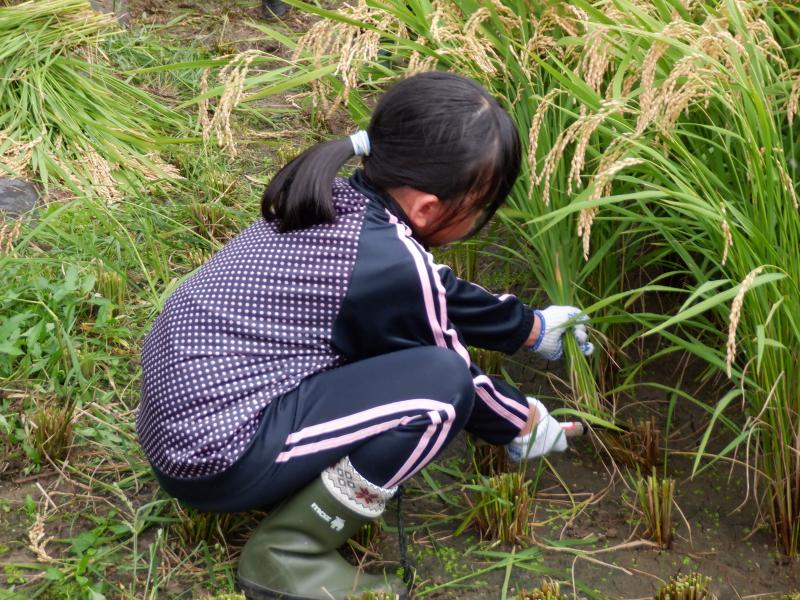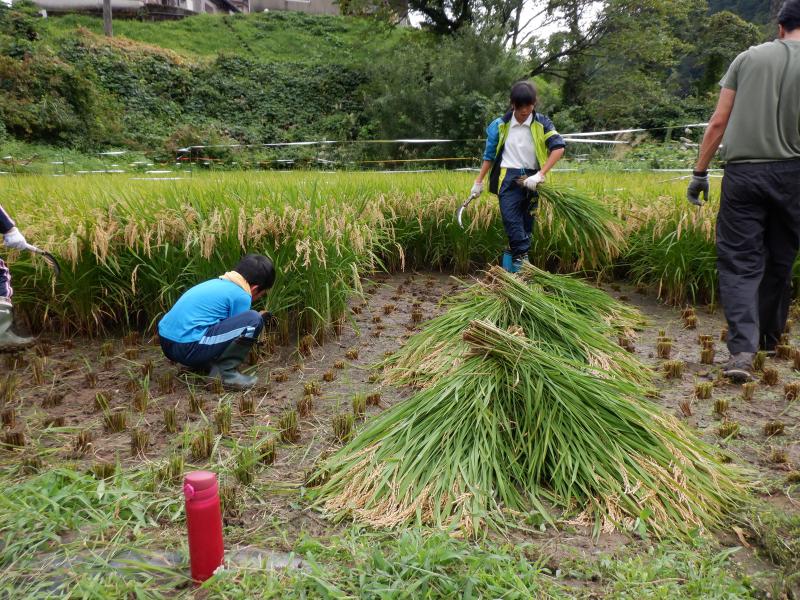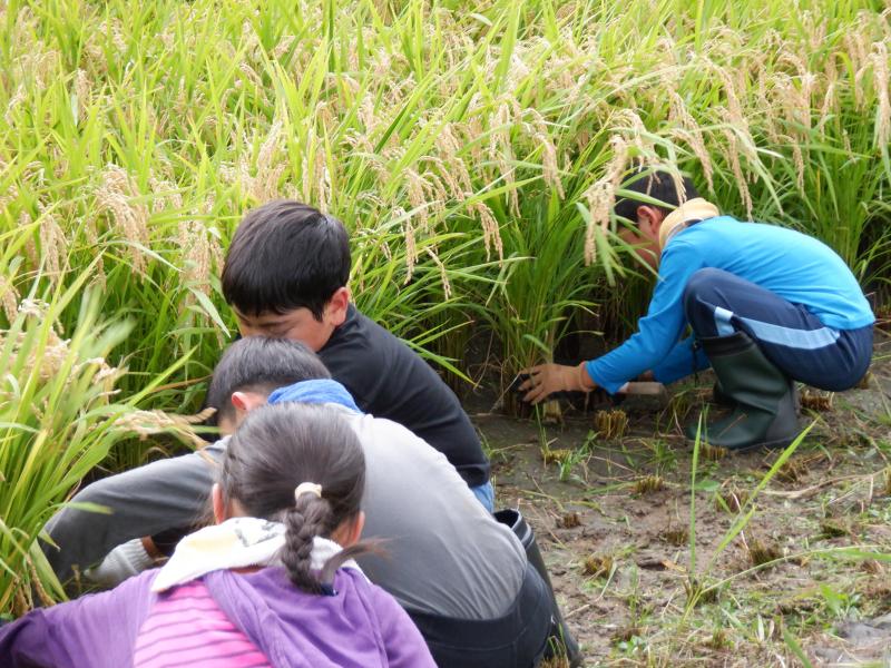 全校で、5月に田植えを行った尾田さんの田んぼで稲刈り体験をしてきました。田んぼに着くとたわわに実った稲穂に「うわぁ~」と歓声が上がりました。 尾田さんから稲刈りの方法を教えいただきました。初めて鎌を手にする子どももおり、とにかく危険のないようにゆっくり慎重に刈り取るように、刈り取った稲は、はさ掛けできるように紐で結わえるため、ばってんに積み上げるようにとの説明がありましりた。 その後はみんなで力を合わせて一生懸命作業を進めていました。初めて稲刈りをする1~3年生も、安全に気をつけて上手に刈ることができました。5・6年生の手際のよさは、「さすが」を通りこして「頼もしい」の一言でした。また、鎌で刈り取った時の「ザクッ」という音の耳ざわりのよさに感激している子どももいました。 刈り取った稲は結わえて「はさ掛け」しました。このときの協力体制もさすが白峰っ子!連携が素晴らしかったです。とても暑かったですが、尾田さんも「よう働く子らや」と【がおって】(驚いて)いました。 11月2日の収穫祭の時にできたお米を飯ごうで炊いていただきます。みんなとても楽しみにしています。きっとおいしいのでしょうね。