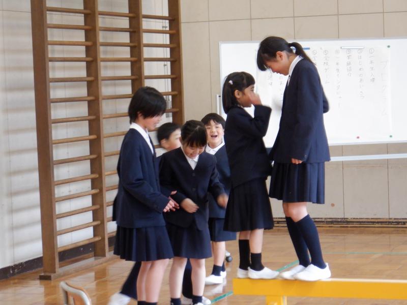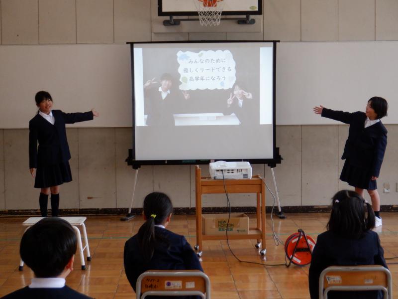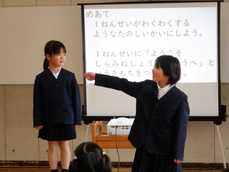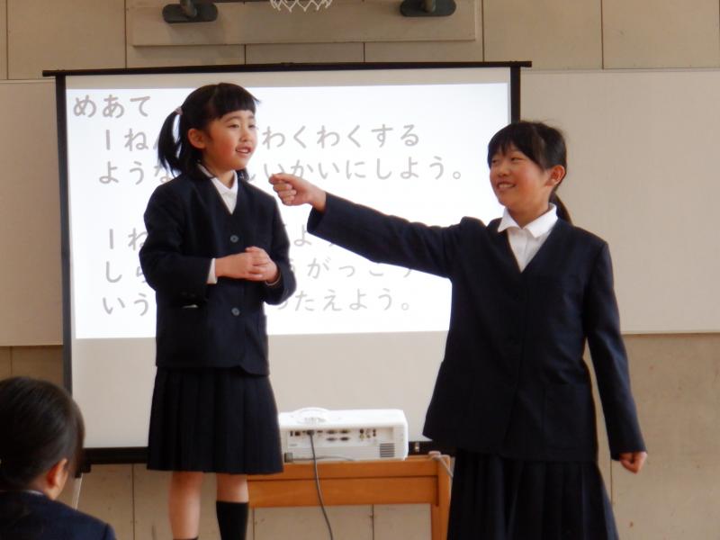 新入生2人のための楽しくて心がほっこり温かくなる1年生を迎える会が、2年生から6年生の団結力のもと、心を込めて行われました。 3年生は、パワーポイントを使って、クイズ形式で学校紹介をしました。楽器を使ってシンキングタイムを表現したり、正解を拍手で盛り上げたりアイデアと工夫がいっぱいの発表で、1年生もニコニコ楽しそうでした。 2年生は、「パワー」全開で学年紹介をしました。教科書を見ないで「ふきのとう」の音読もしていました。1年生にとっては、憧れの2年生ですね。 5・6年生は、会の準備や司会進行など、1年生が喜んでくれるように一所懸命取り組んでいました。また、1年間の行事を紹介し、学校の楽しさを伝えていました。5・6年生のおかげで、白峰小学校がまた一つ大きくまとまることができました。 1年生もみんなの前で上手にインタビューに答えることができました。