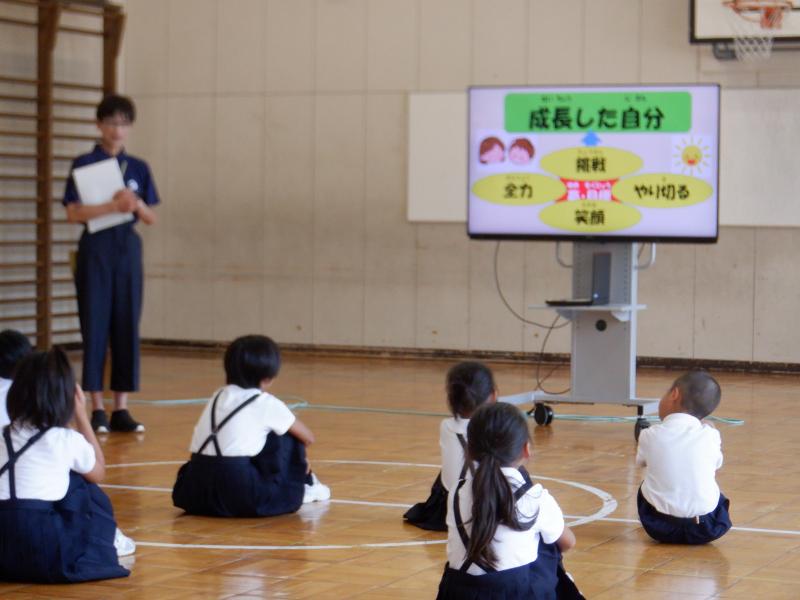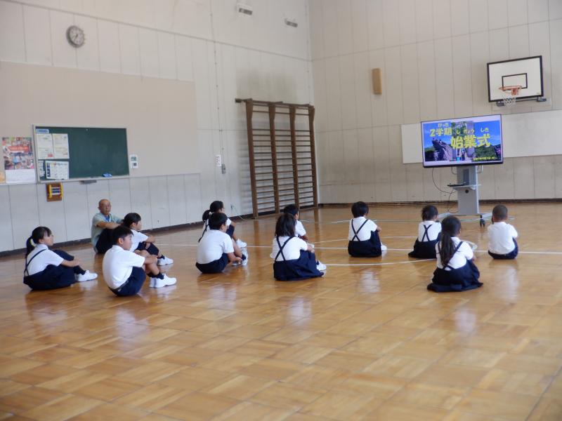 44日間の長い長い夏休みを元気いっぱいに過ごした11名のこどもたちと一緒に2学期がスタートしました。子どもたちの笑顔と元気な声、日焼けしたたくましい姿から、充実した夏休みを過ごすことができたことが伝わってきました。 2学期始業式では、親子白山登山を紹介し、「めあて」や「目標」に向かってチャレンジすること、それを楽しむこと、そして、楽しみながら頑張ることの大切さをお話しました。白山登山は、全員にとって大きなチャレンジであり、苦しい中にも楽しむ瞬間やばんばる時があり、子どもたちも納得しながら聞いていました。また、真剣にお話を聞く姿から2学期への強い意気込みが伝わってきました。 2学期には、全校一丸となって取り組む運動会があります。「挑戦」「全力」「笑顔」で「やり切る」をキーワードに素敵な運動会をみんなで創り上げること、そして、「喜んで登校 満足して下校」できる「笑顔と活気あふれる」白峰小学校にしていこうと伝えました。2学期の子どもたちの成長がますます楽しみです。