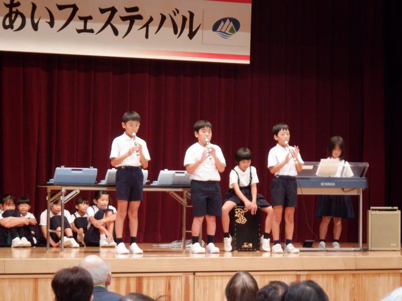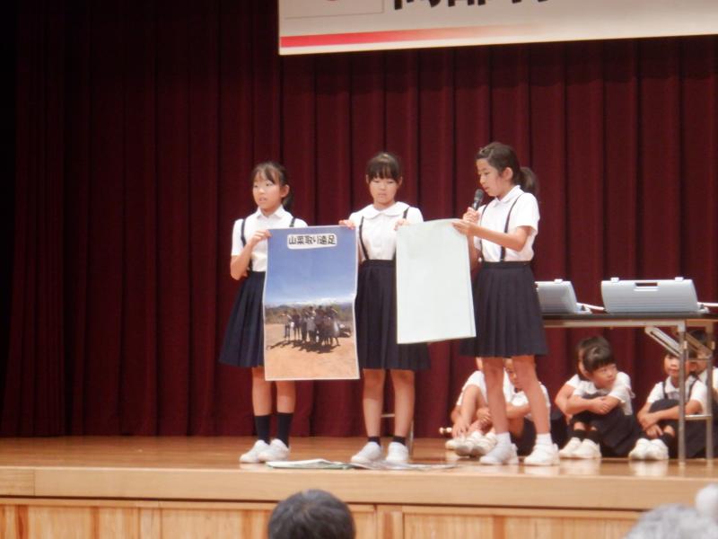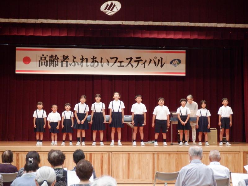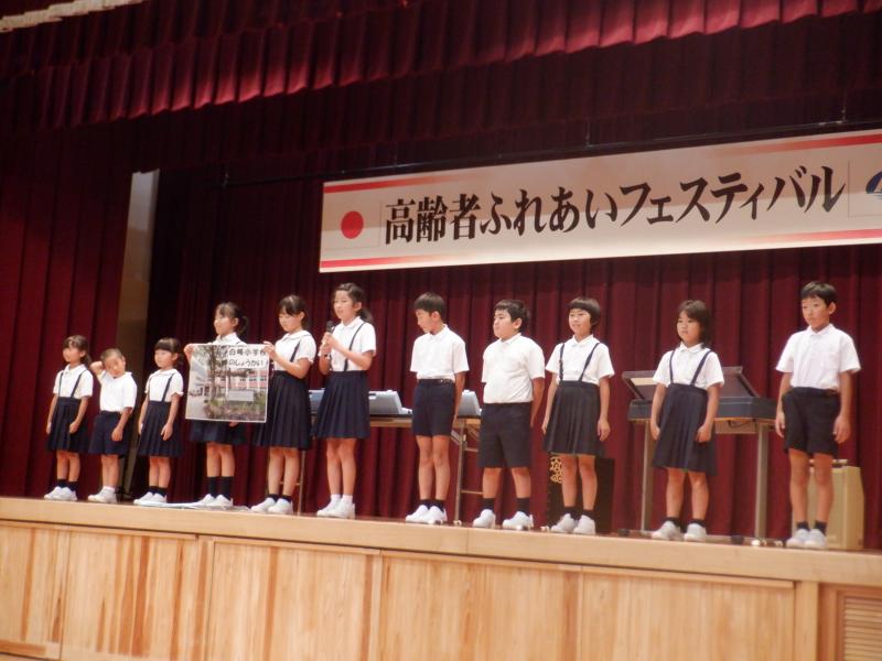 9月9日(火)に開催された白峰地区敬老会で舞台発表を行い、お年寄りの皆さんに元気と笑顔を届けてきました。発表内容は、「学校紹介(5年)」「かえるのうたの手遊びと演奏(1・2年)」「もののけ姫の合奏(3・4年)」「校歌(全校)」です。 子どもたちの元気いっぱいの発表で、会場の皆さんも大喜び!!学校クイズに答えたり、かえるのうたにあわせて一緒に手遊びをしたり、コント風の演出に笑ったりと会場中が笑顔満開でした。また、校歌を歌った際には、会場の皆さんも一緒に歌ってくださいました。小中学生の頃に歌った校歌を、小学生の子どもたちと一緒に歌っているその歌声を聞き、感動で涙があふれてきました。何十年も脈々と歌い継がれている校歌であることを誇りに感じたと同時に、校歌の持つ力、校歌の存在意義を痛感しました。正に会場が一つになったすごい瞬間でした。白峰の将来を担うであろう子どもたちとこれまで白峰地区を守り発展させてくださった皆さんとの絆が一層強くなったように感じました。参加させていただき感謝の気持ちでいっぱいです。 白峰地区がますます元気になるように、もっともっと笑顔でいっぱいになるように、白峰小学校一同パワー全開で頑張ります!!