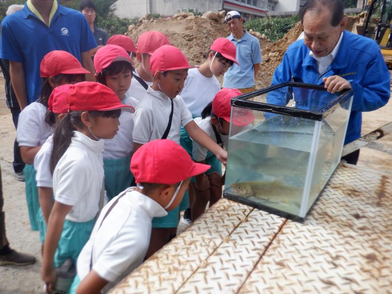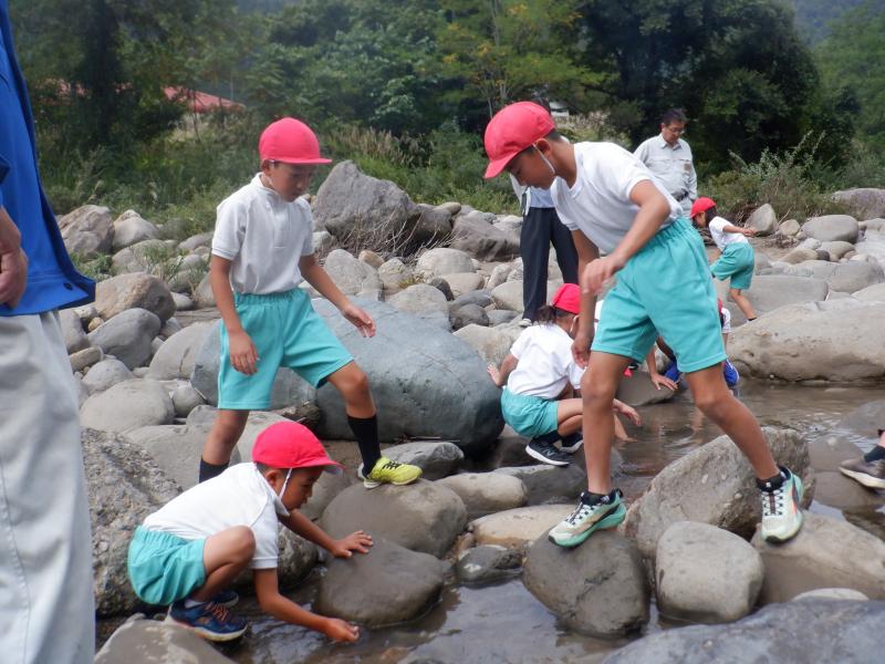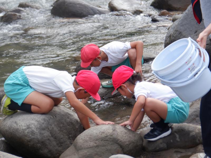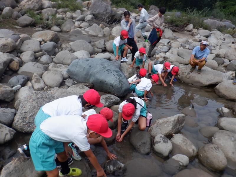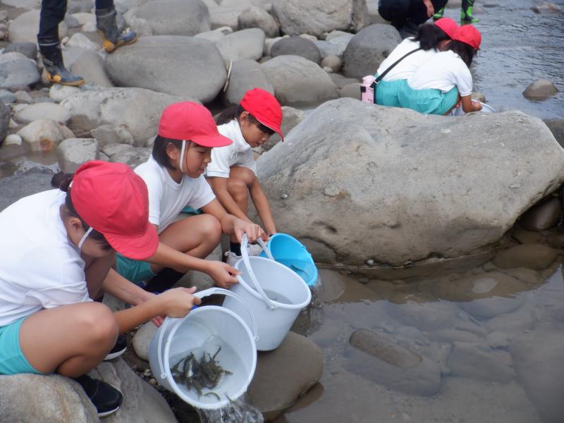 今年も白峰漁業協働組合の加藤さんのご指導のもと、ヤマメの稚魚を放流しました。 放流の前に、放流する理由や牛首川の環境のことをお話していただきました。また、イワナと牛首川の上流にしか生息していない無斑イワナ、サクラマスを実際に見せていただき、子どもたちも興味津々で見入っていました。 牛首川に移動し、いよいよ稚魚を放流。子どもたちは、「またね」「帰ってきてね」と声をかけていました。石のすぐ下にもぐった稚魚を手でそっとすくったり、掌にのせて「かわいい」と見せてくれたり、どの子も愛おしそうに稚魚を放流していました。中には、初めてさわることができた子もおり、とても満足そうな表情を見せていました。 子どもたちは、ヤマメの稚魚の放流を通して、牛首川や周囲の森林等の環境を守っていくことの重要性を学ぶことができました。この子どもたちが今年放流した稚魚が安心して帰ってくることができる美しい牛首川をずっと守っていってくれることでしょう。