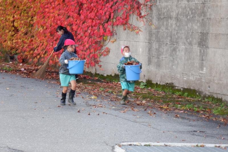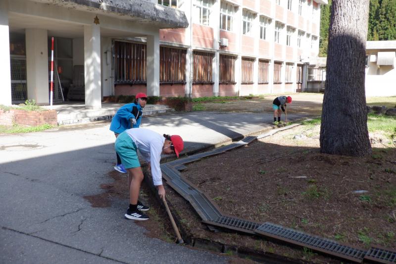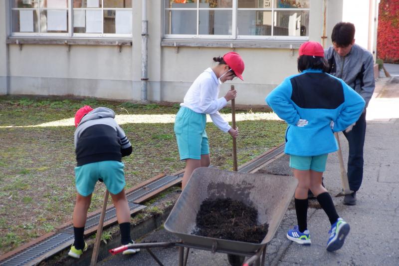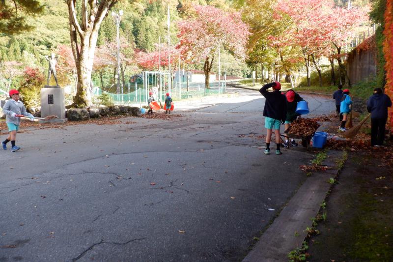 10月28日に予定していた秋の外掃除を11月4日にようやく実施することができました。 当日は、学校の玄関前の駐車場一面に大量の落ち葉が・・・。それを1~3年生が一生懸命に集め、バケツにいれて「エッホ、エッホ」と運んでいました。4・5年生は、側溝にたまった落ち葉を鍬で上手にすくい上げてきれいにしていました。鍬の使い方も一輪車の操作の仕方もどんどん上達し、作業がとてもはかどりました。作業時間は短かったのですが、子どもたちの頑張りと協力体制のおかげで学校周辺が見違えるほどきれいになりました。 白峰小学校の子どもたちは、人数が少ないからこそ一人一人が自分の役割を自覚し、最後までしっかりと作業することができます。また、一人一人がいろいろな役割を担うことができ、その度に経験値が増えていきます。だから、低学年でも様々な作業をとても上手にこなすことができます。白峰小学校の強みの1つです。 さて、白峰は、間もなく厳しい冬を迎えます。私たち大人にとっては迎える厳しい冬も、子どもたちにとっては楽しく、待ち遠しい冬です。子どもたちと一緒に楽しむ気持ちをもって冬を迎えたいと思います。
