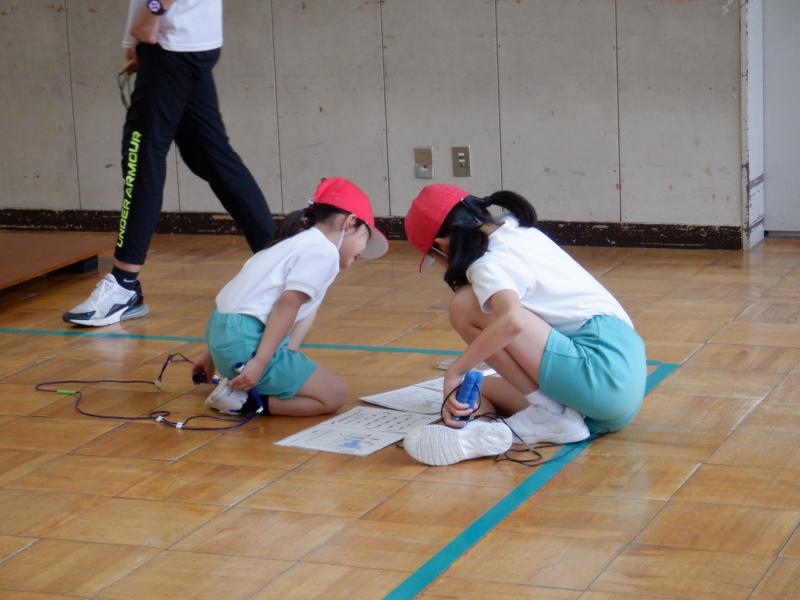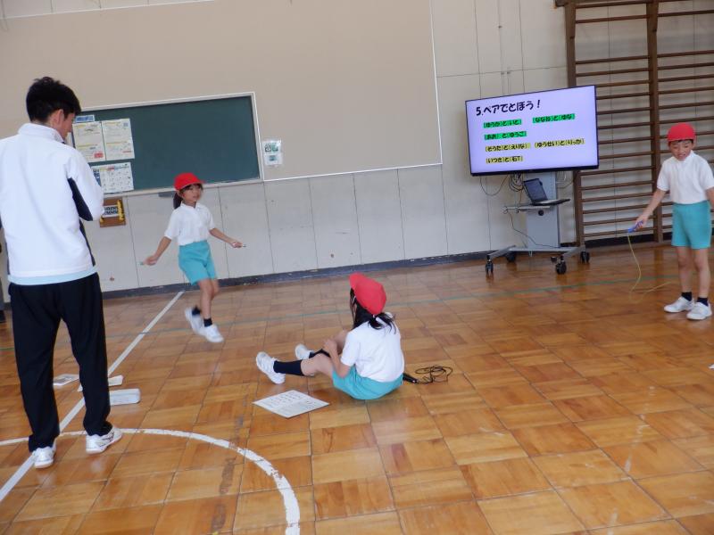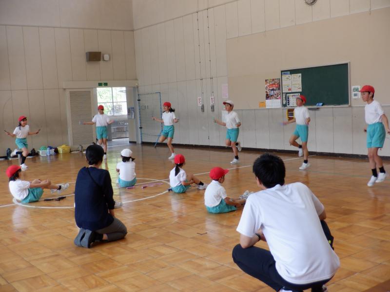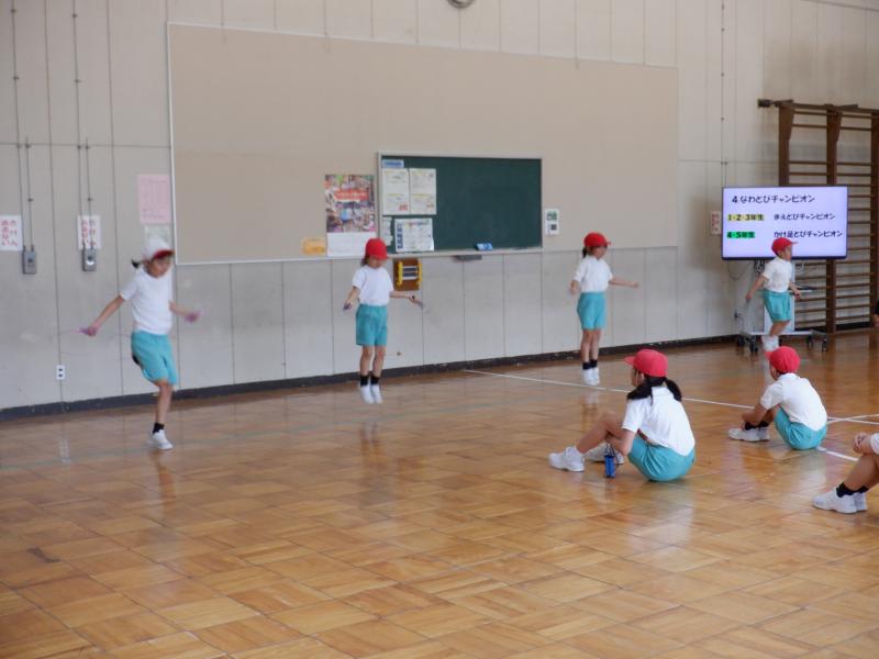 白峰小学校では、体力アップの取組として5・6月と12月・1月の年2回「なわとび週間」を設け、その成果を発表する場として「なわとび集会」を行っています。 今年のなわとび集会では、初めに各自が取組期間中にがんばった技を紹介しました。その後、なわとびチャンピオンとして1~3年生が「まえとび」、4~5年生が「かけ足とび」で競い合いました。最後の「ペアでとぼう」では、異学年同士でペアを作り、教え合ったり数え合ったりしながら技の上達を目指しました。 取組期間中にできる技や回数がどんどん増え、嬉しそうな笑顔をたくさん見ることができました。努力する姿、教え合う姿、喜び合う姿がとても素敵な白峰っ子たちです。