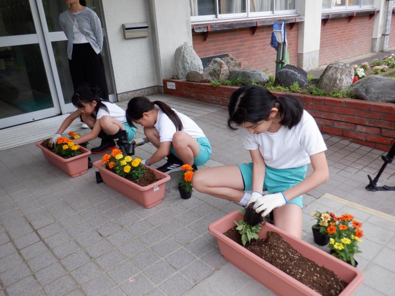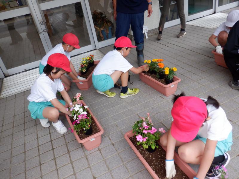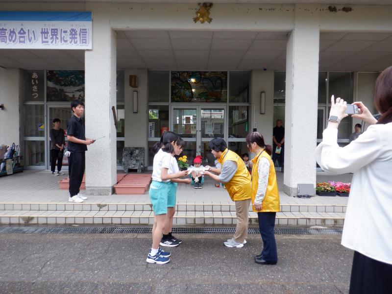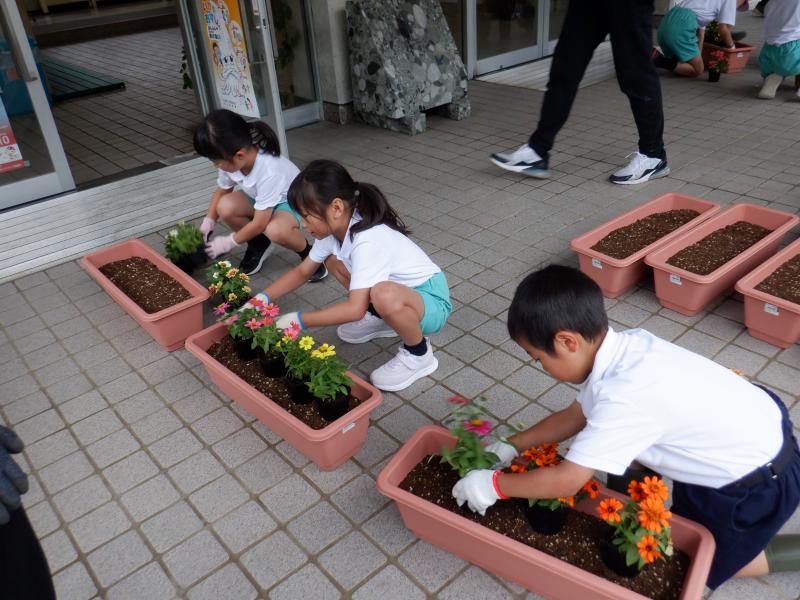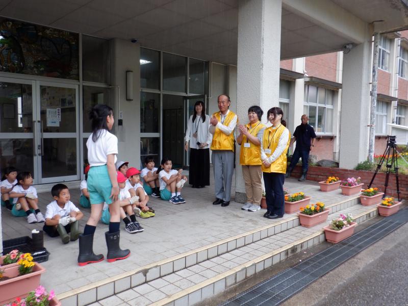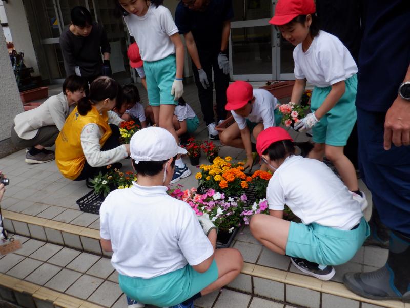 白山市から3名の人権擁護委員の方が来てくださり、人権についてのお話を伺ったり、人権の花を一緒に植えたりする「人権の花」運動を実施しました。人権についてのお話は、低学年には少し難しかったようですが、人権擁護委員の方が易しい言葉で説明してくださったおかげで、人権とは、大人も子どもも大切に守られ、安心して生活できる権利であることを理解することができました。最後に、お花を植える活動を通して、優しい気持ちや全てのものを思いやる気持ちを自分の中に育ててほしいとおっしゃっていました。 真剣にお話を聞いていた子どもたち、お花の苗植えでも互いに優しい言葉をかけながら一生懸命に活動していました。 人権の花は、玄関できれいに咲き、毎日子どもたちを迎えてくれています。また、「今日、お花咲いたよ」と1年生が教えてくれることもあります。優しい気持ちが育っていることを嬉しく思います。