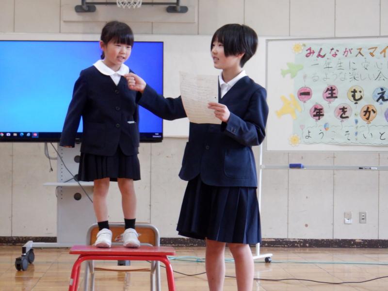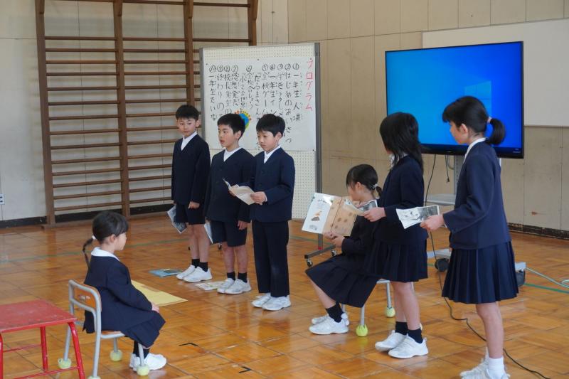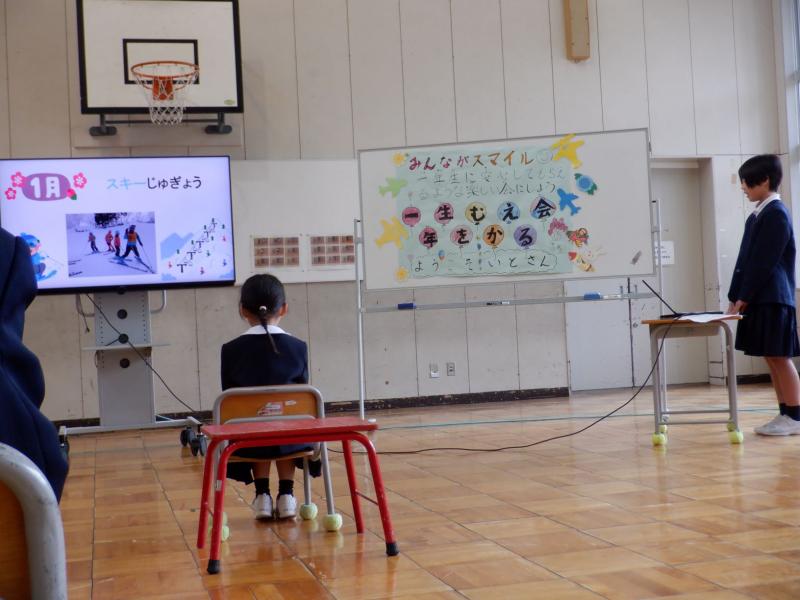 大好きな1年生のための楽しくて心温まる「1年生を迎える会」が賑やかに行われました。めあては「みんながスマイル 1年生に安心してもらえるような楽しい会にしよう」です。3・4年生は、1年生の大好きな恐竜が出てくるお話の読み聞かせを行いました。台詞の言い方を考え、楽しめるように工夫していました。2年生は、全校児童と先生方にインタビューした結果をクイズで紹介しました。ちなみに、白峰小学校で人気の給食のメニューは何だと思いますか。6年生は、パワーポイントで白峰小学校の1年間を紹介しました。楽しい内容ばかりで1年生もワクワクしたことでしょう。また、1年生も堂々とインタビューに答える素敵な姿を見せてくれました。(担任の先生をちらちら見ながら答えるところが初々しかったです)1年生のために一人一人が最大限の力を発揮し協力することで、大きな学校に負けないくらいの素敵な会を創り上げることができました。これからもみんなで力を合わせて夢や希望がいっぱいの笑顔と活気あふれる楽しい白峰小学校にしていきましょう。