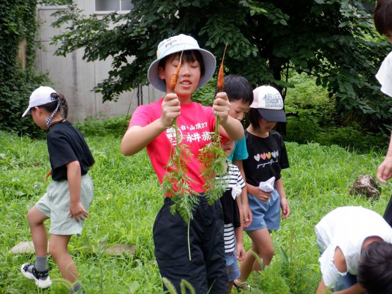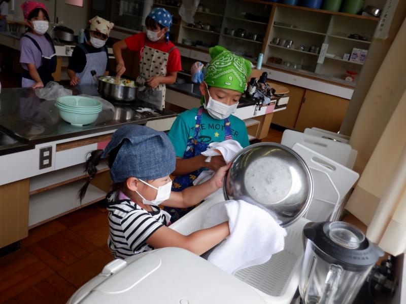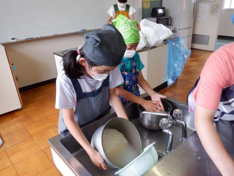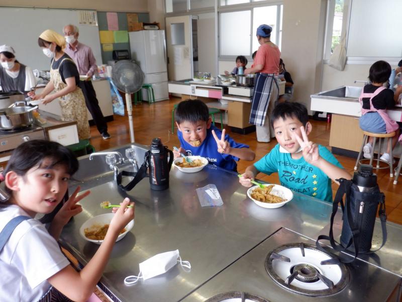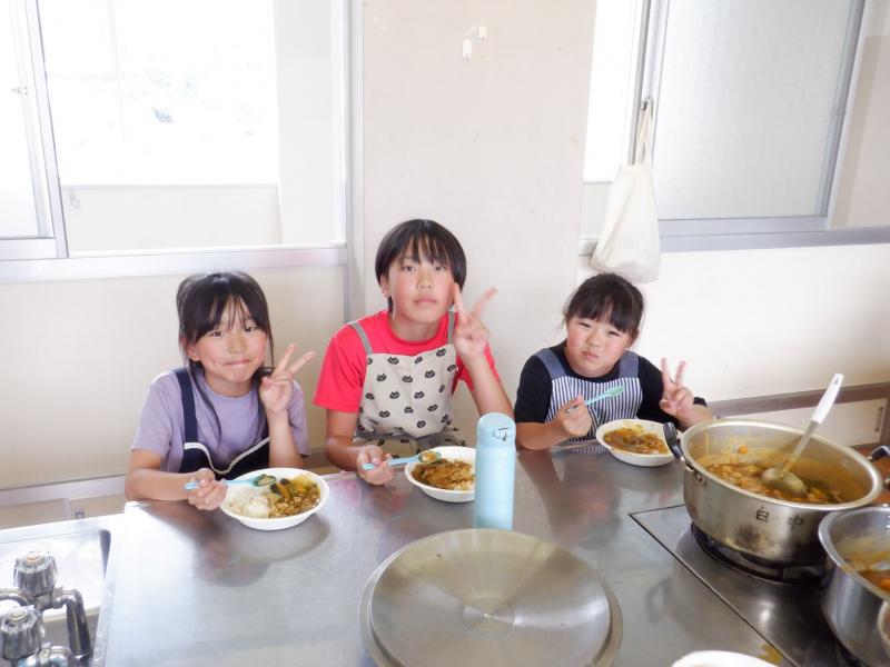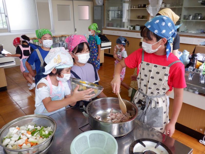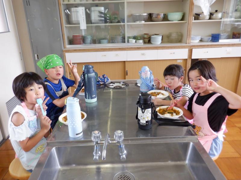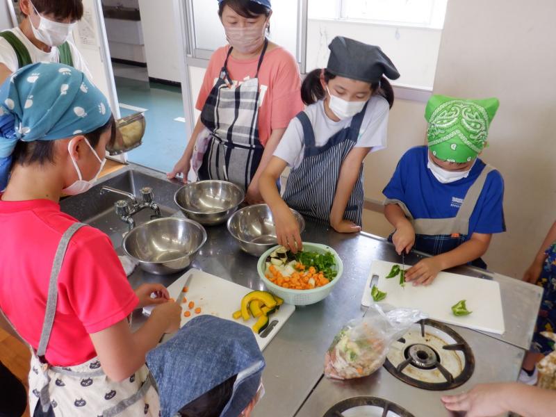 「学校農園で作った野菜で夏野菜カレーを作って食べたい!」という6年生児童の昨年からの願いを実現すべく、今年度も夏休み料理教室を開催しました。(実は、6年生児童は、昨年度体調不良でこの教室に参加することができず、すっと「リベンジしたい」という願いをもっていたのでした。) 当日は、野菜の収穫からスタート。ナス、ピーマン、トマト、ジャガイモ、カボチャ、ニンジン、キュウリ(ズッキーニは先に収穫し、冷凍保存)を収穫し、早速調理を開始しました。子どもたち10名は、お米を研いだり、野菜を洗ったり、皮をむいたり、野菜を切ったり、危なくないか声をかけたり、炒めたり、混ぜたりとそれぞれ役割分担しながら楽しく調理することができました。また、この日は、学童クラブの先生もお手伝いにきてくださり、子どのたちの調理を見守ってくださいました。ありがとうございました。 ようやく完成したカレーは、中くらいの鍋3杯分!こんなにたくさん食べられるかなという我々の心配をよそに、子どもたちは何杯もおかわりし、1升2合のご飯とともにほぼ完食・・・。収穫したての野菜を使ったからでしょうか、子どもたちの愛情がたっぷり入っていたからでしょうか、本当に美味しく仕上がりました。今度は親子行事でカレー作りをします。また、ぜひ美味しいカレーを作ってくださいね。