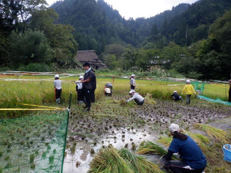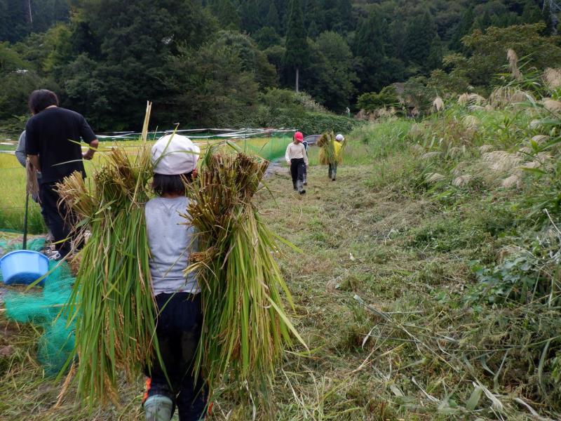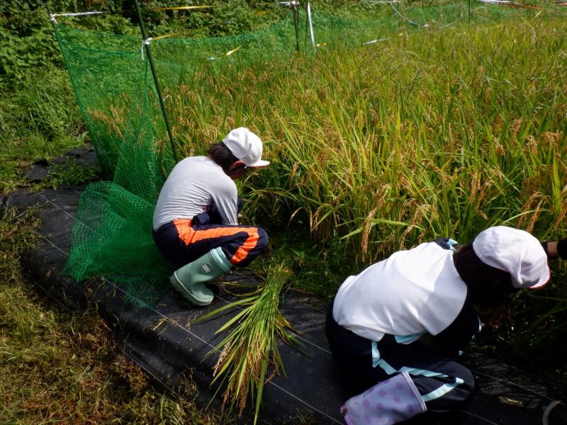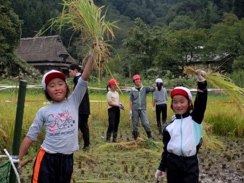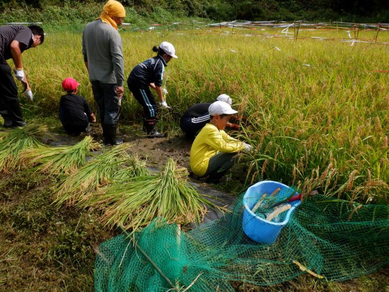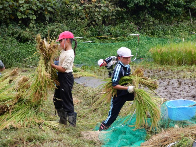 5月に田植えを行った尾田さんの田んぼで稲刈り体験をしてきました。学校で、稲刈りのめあて「お米を食べられることへの感謝、お米を育てている方々への感謝」を確認し、感謝の気持ちを込めて稲刈りすることを共通理解して出発しました。雨上がりの大変暑い中でしたが、尾田さんから稲刈りの方法を教えていただき、その後は昨年経験している2年生以上の子どもたちみんなで力を合わせて一生懸命作業を進めていました。特に、2年生の二人は、昨年怖々と作業をしていたことが嘘のように、「お休みした1年生児童の分まで頑張るぞ!」と汗だくになりながら楽しそうに稲刈り体験をしていました。大変立派で感心しました。3年生も真っ赤な顔で「暑い!」と言いながらも手を止めることなく作業を続け、ますます頼もしく感じました。高学年の子どもたちは、やや暑さにバテた様子でしたが、最後はいつも通りの力を発揮し、たくさんの稲の束を運び「はさ掛け」していました。尾田さんから「みんな上手やし、週末稲刈りしい(・・)に(・)こいや」と誘われるくらい、どの子どもたちも見事な作業ぶりで、さすが「白峰っ子」とういう姿でした。収穫したお米は、11月5日の収穫祭の時にいただきます。子どもたちも今からとても楽しみにしています。お世話くださった尾田さん、暑い中ありがとうございました。