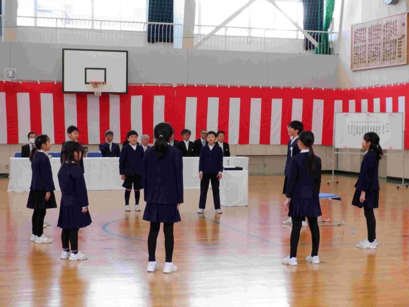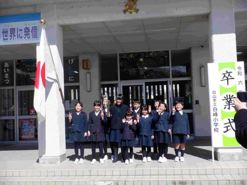 まるで卒業を惜しむかのような前日の名残雪・・・。それでも、真っ白で美しい白峰らしい風景は、卒業生の門出を祝ってくれているようにも感じました。そんな中、卒業生1名と在校生9名が創り上げた温かな中にも厳かな雰囲気漂う素晴らしい卒業式を無事執り行うことができました。卒業生の清々しく凜々しい、背筋がすっと伸びた美しい姿。そんな卒業生を大きな瞳で真っ直ぐ見つめる在校生。そして、最後の送る言葉や歌…。この1年で築き上げた全校児童の温かで強い絆を感じました。 最後は、玄関先まで全員で見送り、みんなで記念写真を撮りました。その後も卒業生から離れることができず、涙涙のお別れ・・・。卒業生が今日の日までどれだけ在校生のために尽くしてくれたのかがわかるひとときでした。本当にありがとう!! 今後も、卒業生が在校生に残した白峰小学校のよき伝統を受け継ぎ、在校生みんなでさらに素晴らしいものへと発展させてくれることでしょう。安心して中学校へと巣立ってくださいね。これからの活躍を楽しみにしています。保護者の皆様、長きにわたり白峰小学校にお寄せいただきました温かいご支援、ご協力に心から感謝申し上げます。ありがとうございました。