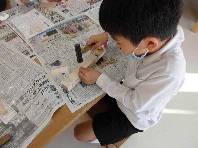 かなづちで手を打たないようにしっかり打つところを見ながら一生懸命に釘を20本以上打っていました。
