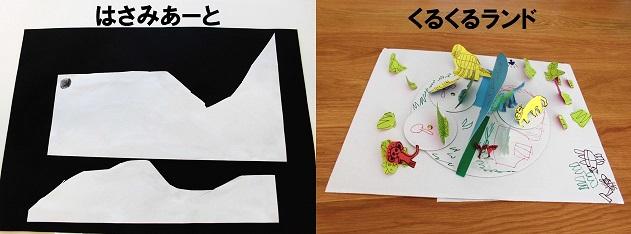 2年「はさみあーと」では,はさみで紙を自由に切ることを楽しみ,切った形を見ながら表したいことを見付け,いろいろな形や触った感じなどを捉えながら,切り方や置き方を工夫して絵に表すことを頑張りました。