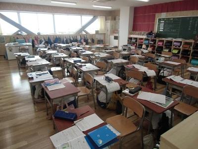 強い揺れを伴う地震が発生したという想定で、机の下に潜る「安全行動」を取りました。