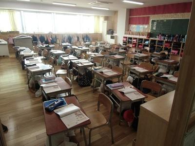 学校の廊下も、水で滑りやすくなっていました。