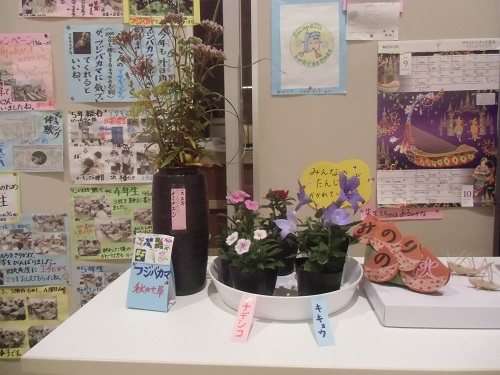 玄関ホールに学校コーディネーターの駒井先生が秋の七草を飾ってくれました。