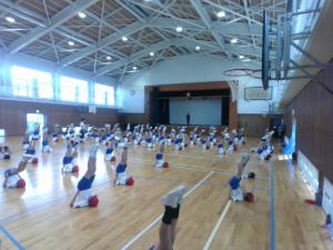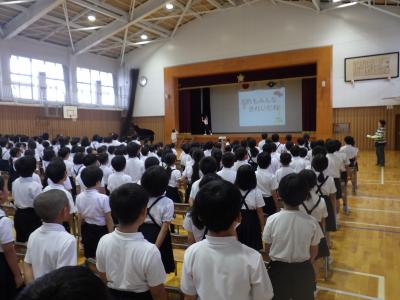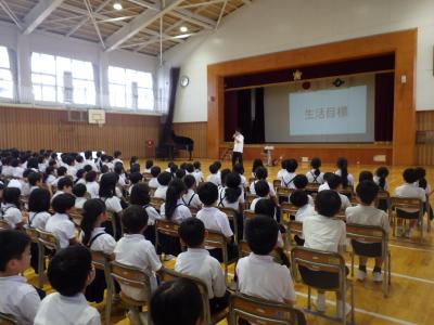 今日の集会は、150周年記念式典の並び方練習を兼ね、椅子を使用して行いました。