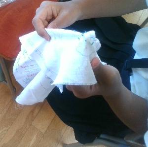 6年生は家庭科で玉結びと玉どめを練習しています。