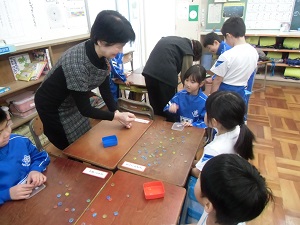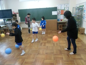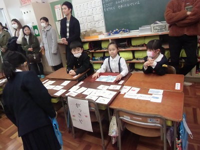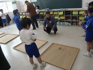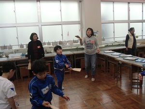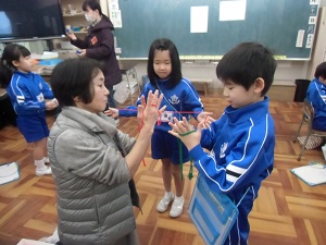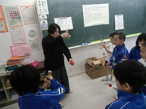 1年生の昔遊び体験に、保護者や地域の方々に来ていただき、遊び方を教えて頂きました。