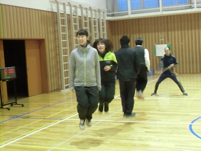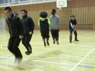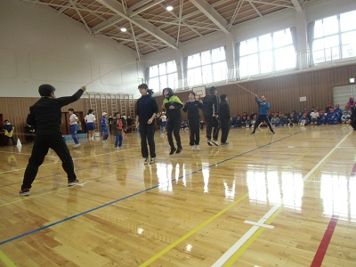 明日23日の長なわ大会に向けて教職員が放課後練習をしています。