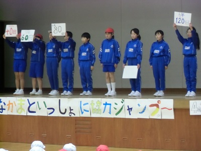 「なかまといっしょに協力ジャンプ」のスローガンのもと長なわ大会が行われました。