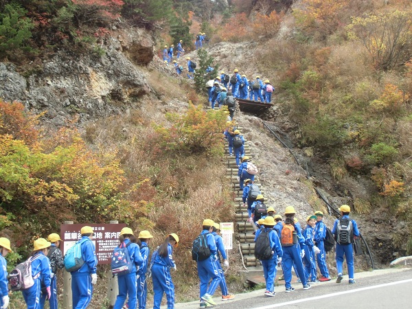 最初は急な階段が続きます。みんなで声をかけ合い登りました。