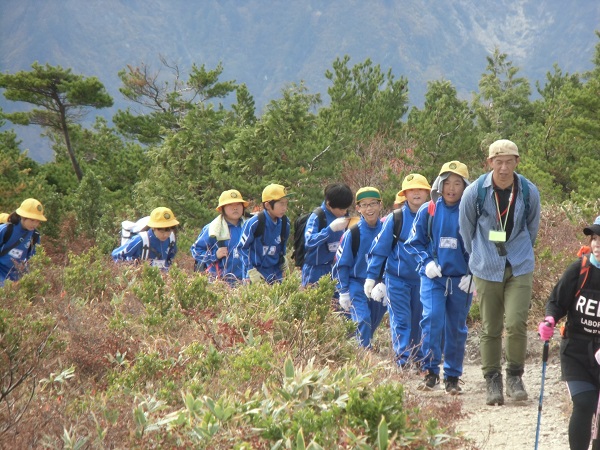 今から登山開始です。 自然の家の所員バッシーさんからお話を聞いていよいよ出発