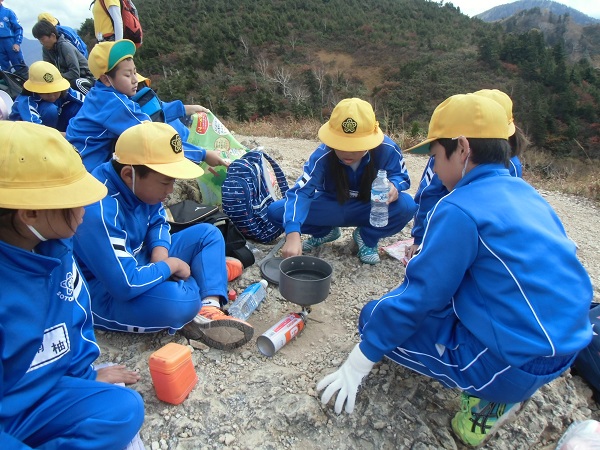 コッヘルを使ってお湯を沸かす方法を教わりました。山頂で食べるカップ麺の味は最高だそうです。