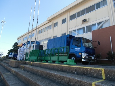 2018年10月3日 09時30分昨日、運動会の本部テントがあった場所に、早速、工事車両が入り、仮設玄関の工事が始まりました。運動会の延期で、待ってもらっていたので、急ピッチで行われています。