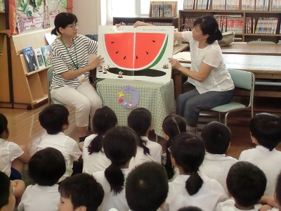 今日は、9名のボランティアの皆さんに来て頂き、スイカや七夕にちなんだお話を