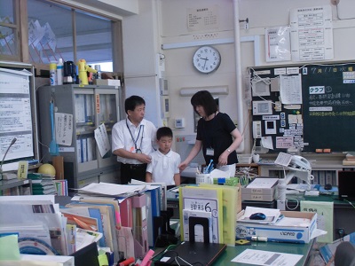 不審者が侵入したことを児童が職員室に連絡しに来ました。