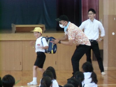 不審者からの逃げ方を4人の2年生が代表して練習しました。