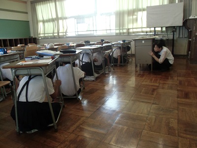 放送の合図の後に「しゃがむ、隠れる、じっとする」といった「安全行動」を約1分間行いました。