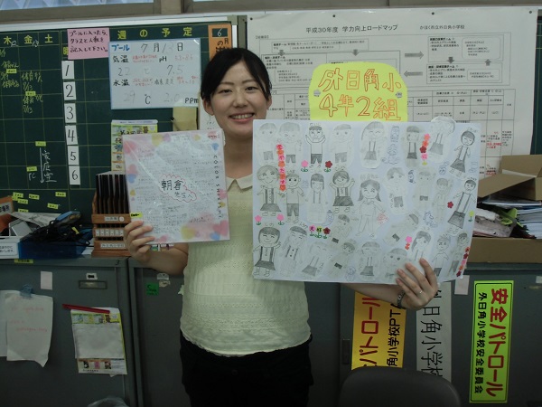 そこで、子ども達は先生に内緒で寄せ書きと似顔を準備していて、今日のお楽しみ会でプレゼントしたそうです。子ども達の心のこもったプレゼントを手に朝倉先生の瞳は少し潤んでいました。