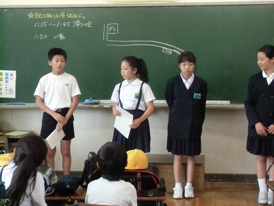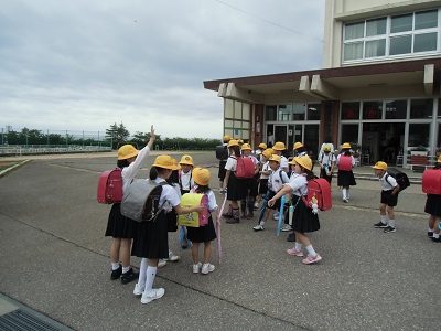 自然災害や犯罪から子ども達を守ることを目的に、集団下校訓練を行いました。最初は、下校班ごとに決められた教室に集合し、高学年リーダーが人数を確認しました。また、下校時の注意点や地域の方々へのあいさつの仕方を話しました。その後、遠い地域の班から下校を行いました。最近は、市内でもクマやサル等の野生動物が目撃されるなど、本校でも集団下校を行わなければならない事態が想定されます。そのような折りは、地域の方々の見守り、協力を是非にお願いいたします。