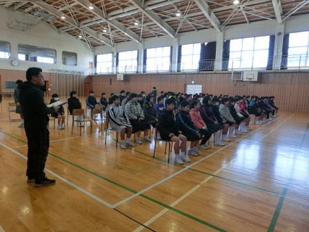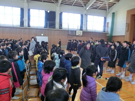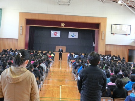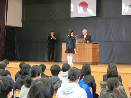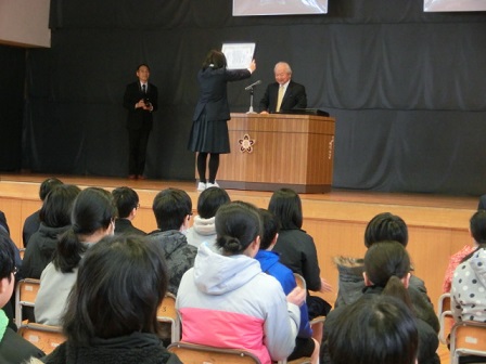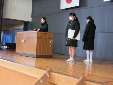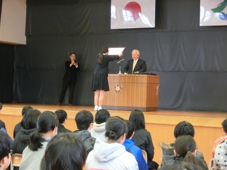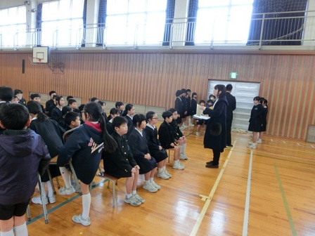 今日、卒業式の全体練習に先立ち、清水賞の表彰式が行われました。この賞は、旧高松町で電気店を営んでいた清水源太郎氏が経済的事情により進学できない中学生のために資財を投じて支援したのが始まりです。現在は、日頃努力する若い人を表彰するものとして50年以上も続いています。本校の6年生3名が表彰を受けました。