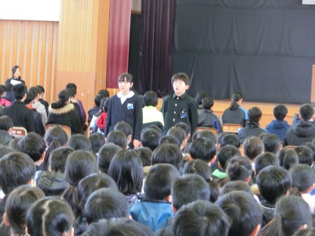 今日の4限目に全体練習が行われました。別れの言葉を長めに通すことが今日のめあて。そのためには、どこで立ったり座ったりするのかを覚える必要があることと、素早くそして音を立てずに行うことが必要です。低学年も集中を切らさないで、ちゃんとやらなければなりません。