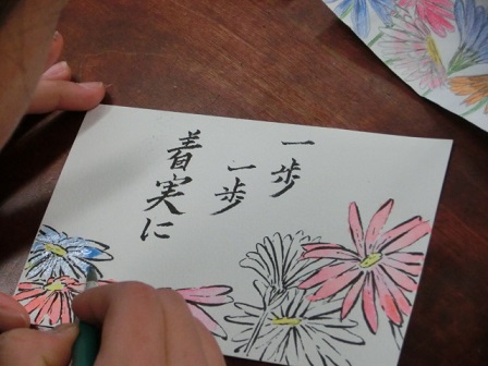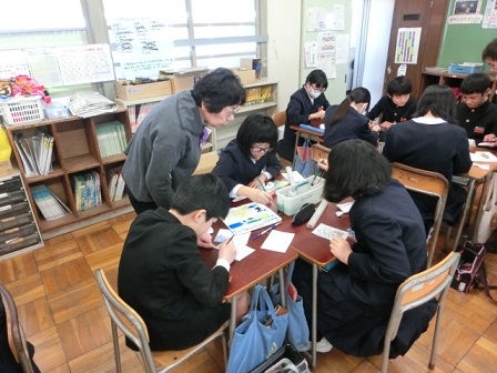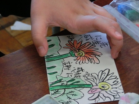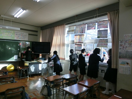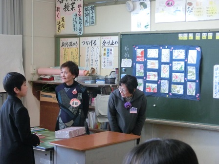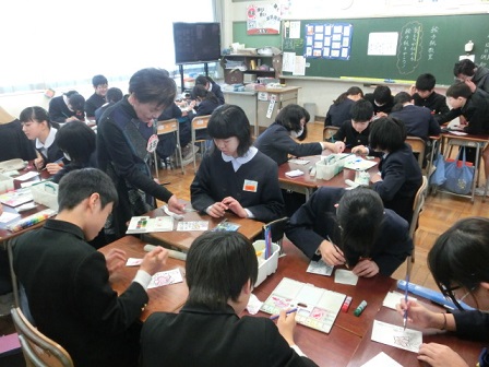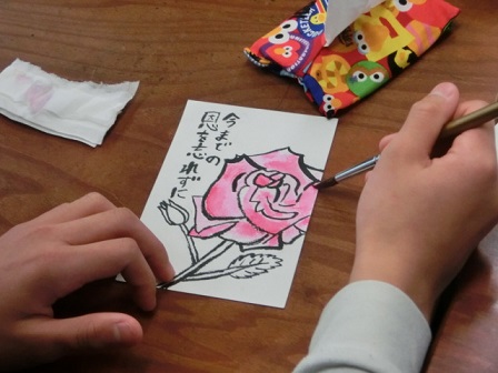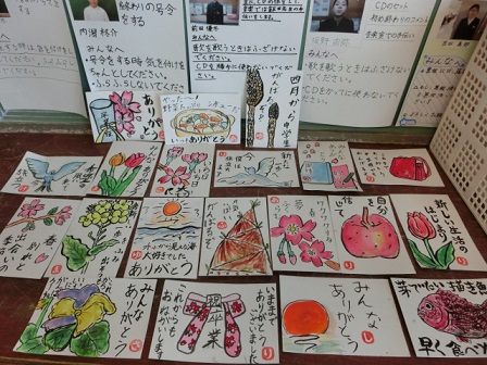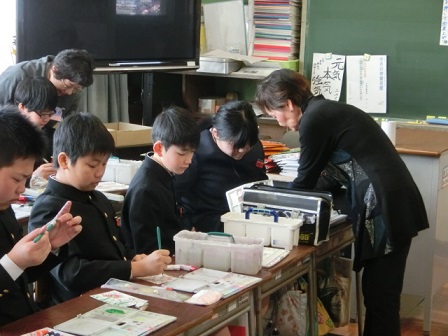今日、6年生が卒業にあたっての想いを絵手紙に表しました。教えて下さったのは吉田さんと七野さんです。一人一人が考えた絵と添える言葉、どれも気持ちのこもった素敵な作品に仕上がりました。卒業式の日は、保護者控え室の廊下側に掲示しますので、ご覧下さい。
