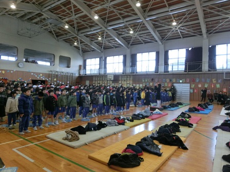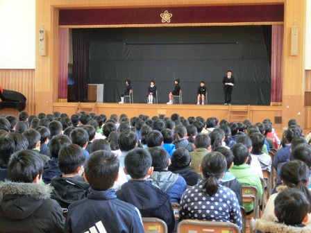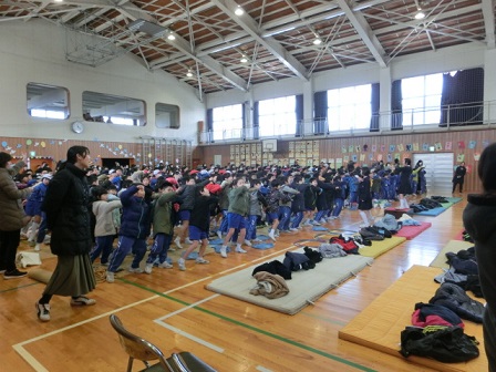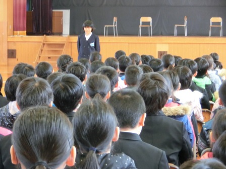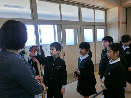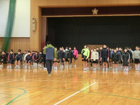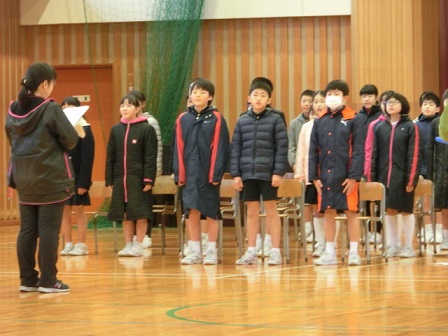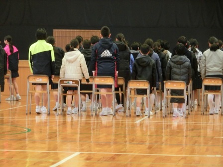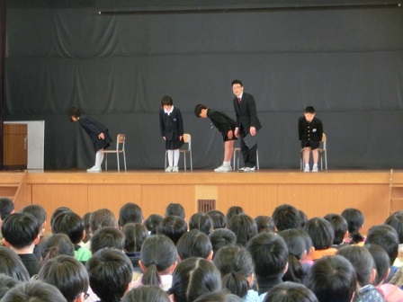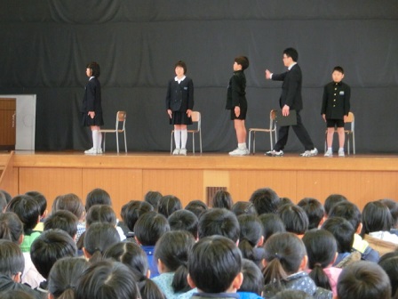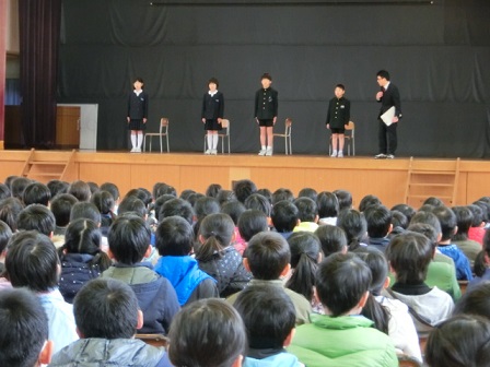 今日の5限めに在校生初めての卒業式練習が行われました。卒業式にあたっての心構えや身だしなみ等について話が合った後、「起立・礼」や、別れの言葉の練習をしました。お手本を見せるのは、在校生の最高学年、5年生です。
