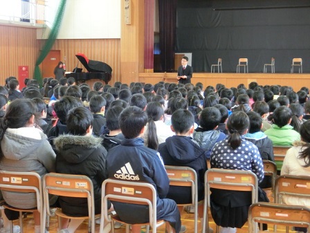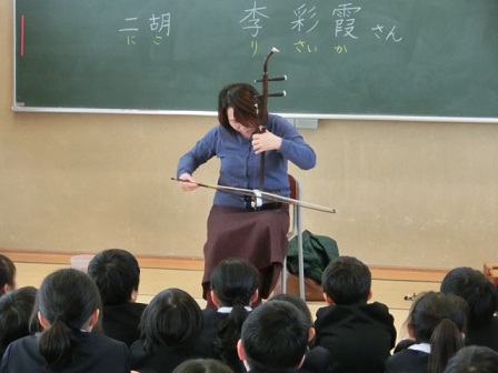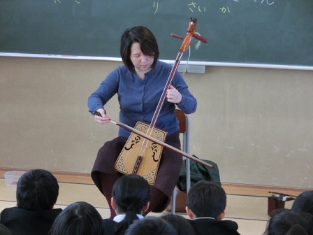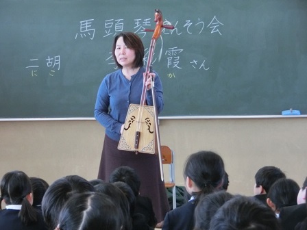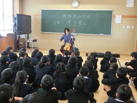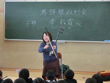 今日の3限目に、二胡奏者の李彩霞(りさいか)さんに来ていただき、馬頭琴と二胡の演奏を聴きました。国語の「スーホの白い馬」の学習に合わせてのことです。モンゴルの楽器、馬頭琴。「楽器の一番上が馬の頭の形をしているので、馬頭琴というのです。」と教科書に書かれ「いったいどうして、こういう楽器ができたのでしょう。それには、こんなお話があるのです。」で、物語が始まります。馬頭琴の音色は?子どもたちは興味津々。想像より大きくて力強い音がしました。モンゴルの大草原が思い浮かぶような感じでしょうか。白馬とスーホの物語、馬頭琴の音色と共に、忘れないかもしれませんね。